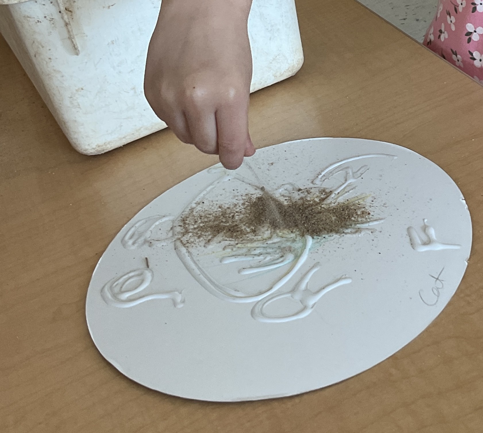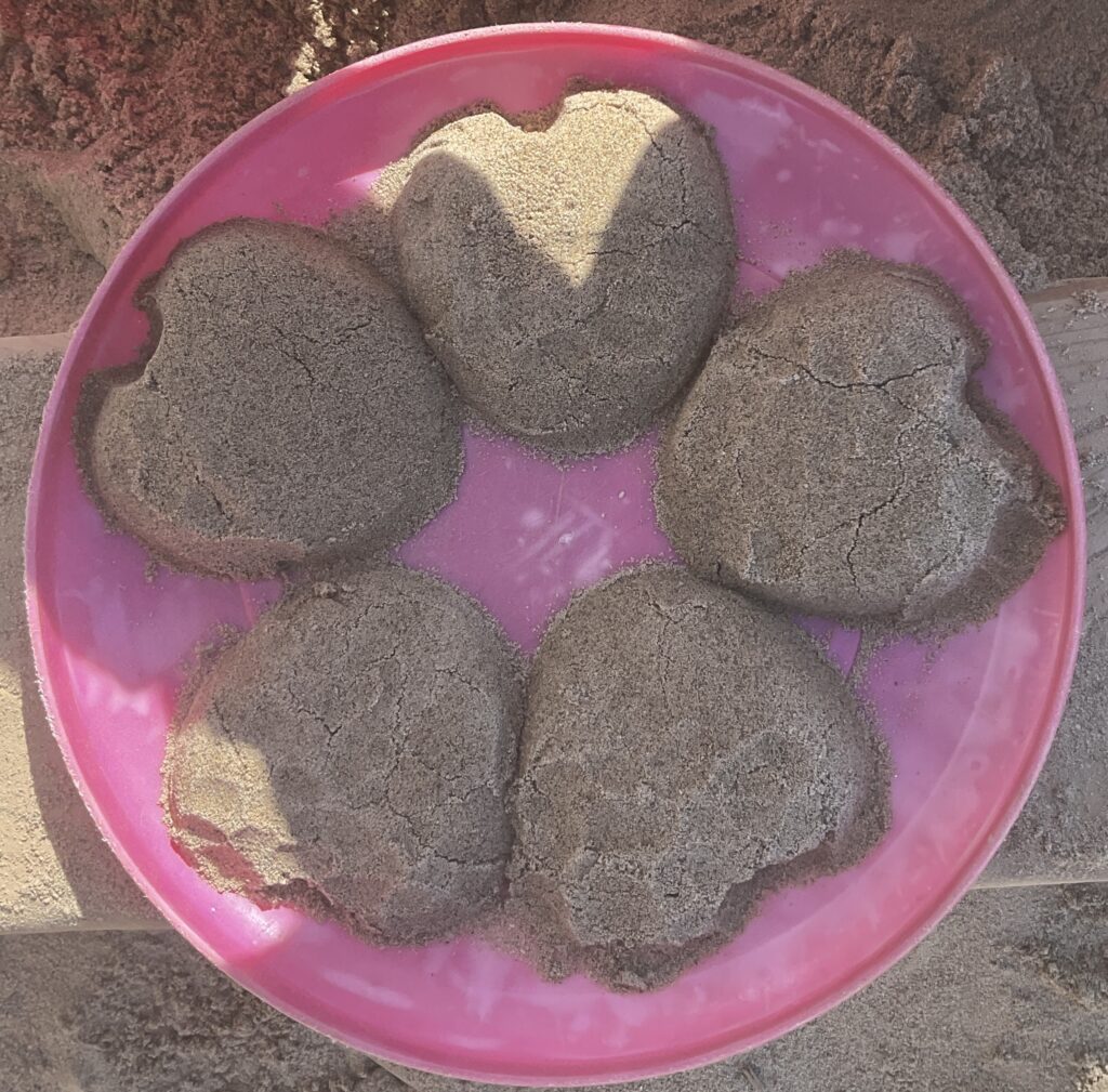 The preschoolers are full of life and curiosity. They enjoy the many experiences provided by the educators, as well as the ones that come naturally in our outdoor classroom. They play as a group or they play alone; one thing they have in common is the love for the sandbox. A place where they can kick off their shoes, dig their toes in deep and feel that cool, rough texture. It’s a place to make cakes, cookies and mud pies in a bakery, to drive trucks around the construction site or dig for dinosaur bones. Their imaginations can run wild and there are no limits to what they can do. For the majority of the time the sand is outside but, when that interest is so big we want them to explore it anytime! The construction site that was built in the tough table was admired, enjoyed and eventually destroyed. It creates smiles, encouraged conversations between friends and educators and expanded on the interests of the children, supporting the emergent curriculum. This interest was then used as a creative experience with glue. The sand was sprinkled so carefully onto paper plates. This was then pushed further into science where it was mixed with flour and oil to create “sand dough”. Small pots were used to plant a garden using beans as seeds. That garden encouraged the need for soil, where basil was planted and cared for until it was talked about during circle time and the topic of conversation at the lunch table. We see sandboxes in every playground, we walk through it at the beach and we sweep it from our kitchens floors. Do you ever stop to think about the many ways sand can inspire us?