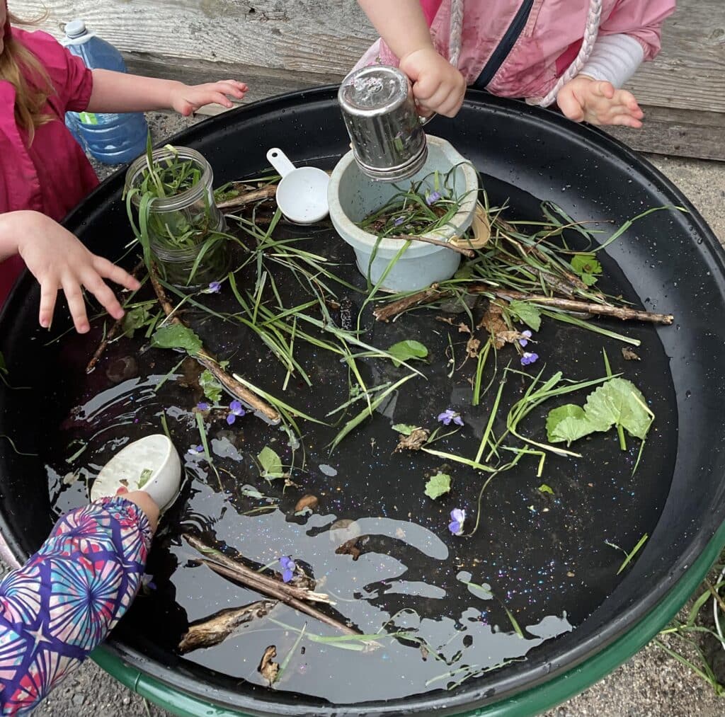 The next day, we took our bags of “treasures” outside during our outdoor learning time. We brought out the tuff tray and quickly began preparing and cooking some “Nature Soup”. The sounds of delighted children chattering filled the air. There were discussions regarding the different ingredients they were adding and what the nature pieces represented. One child could be heard letting her peers know to “Be Careful”, as she added the pinecones because they were “Spicy”. Another child handed out sticks because “That’s how we stir soup”! It was a joy to be able to utilize our nature pieces alongside our outdoor pots, pans and utensils for this activity. We look forward to making more delicious soup in different seasons and we may even make our own recipe book some day!